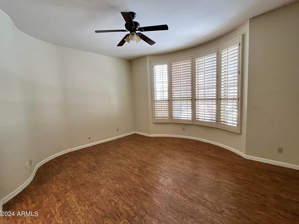 - The primary bedroom has Shaker Shutters, wood-like flooring, and a ceiling fan.