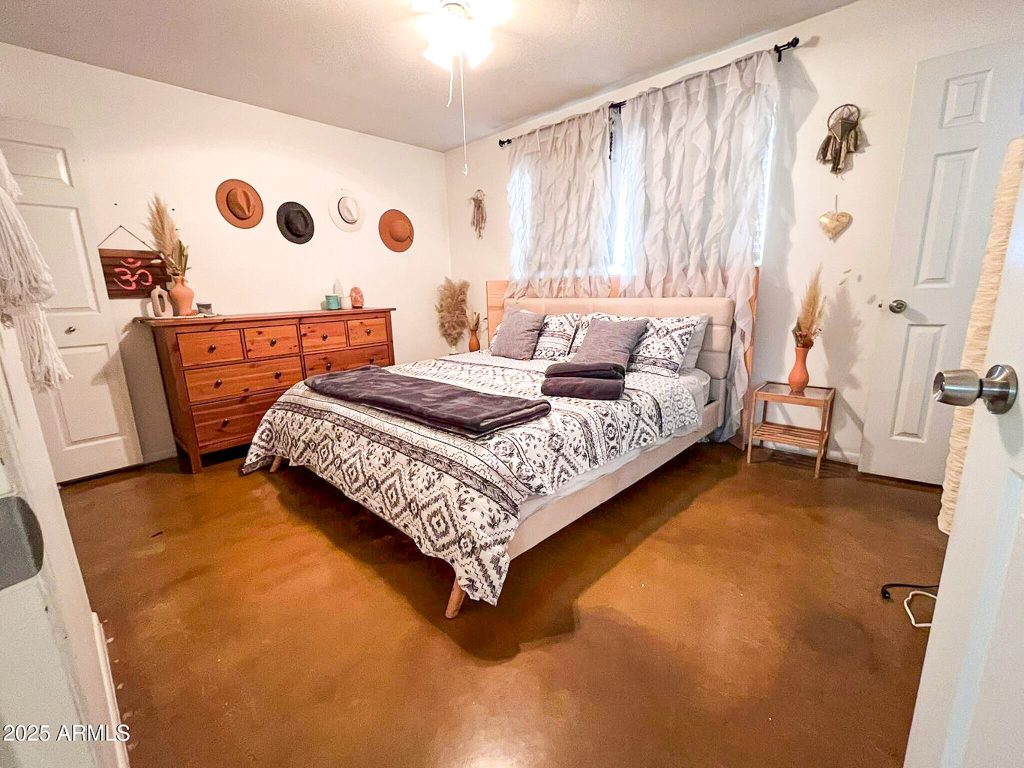 - The primary bedroom is en suite with stained concrete floors.