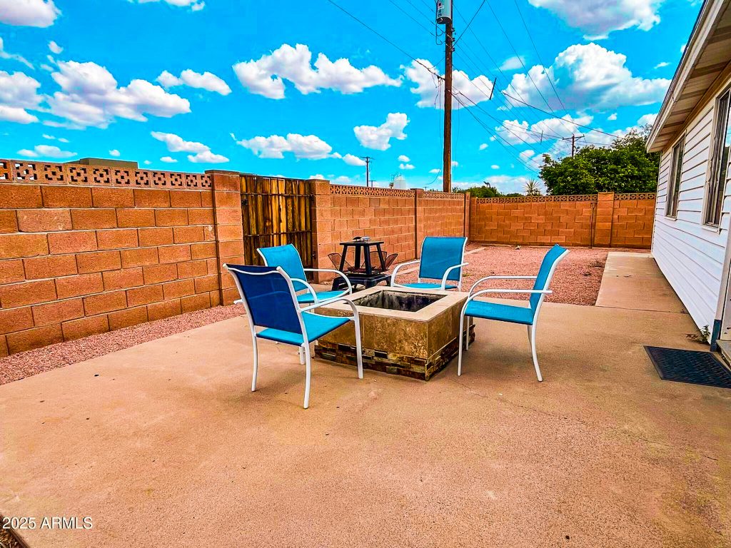 - The private backyard offers a covered patio and a conversation pit—ideal for relaxing or entertaining.